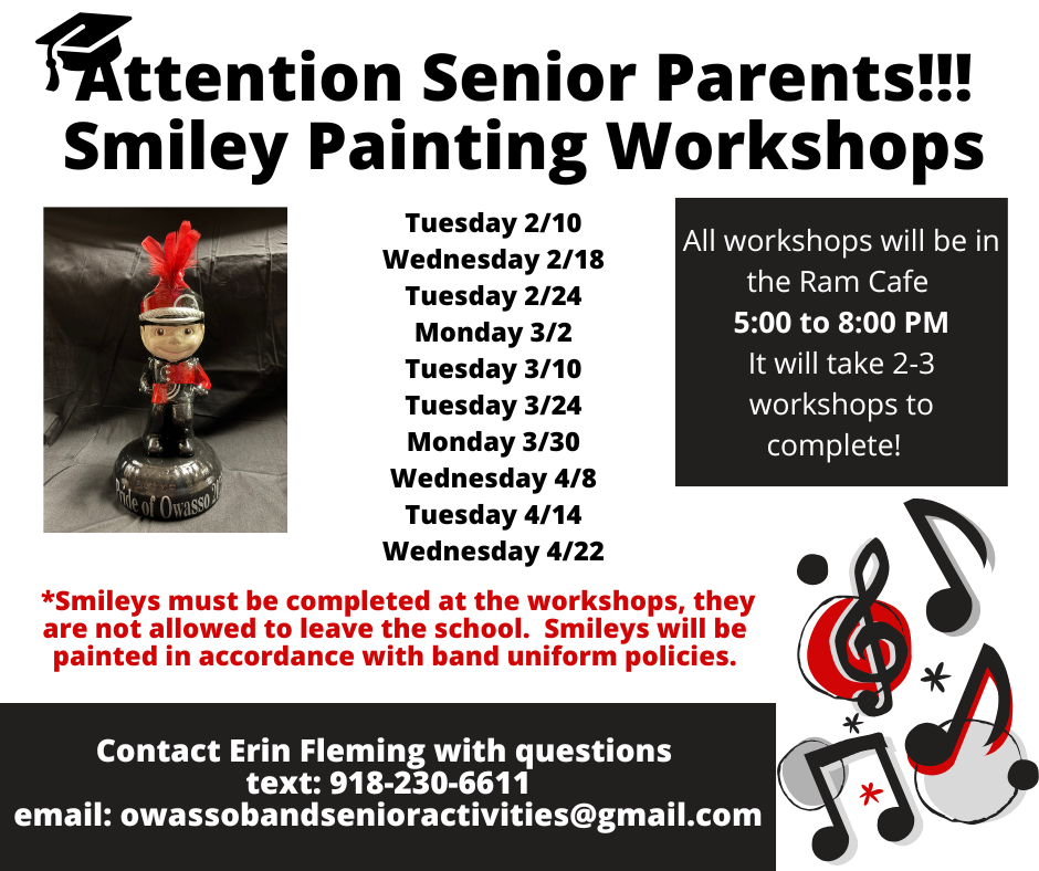 Senior Night is October 16! At this Owasso Bands tradition, each family decorates a large cardboard ‘O’ for their senior to display during recognition. Senior O Workshops provide time to create these keepsakes, with volunteers on hand to assist, prepare materials, and help with cleanup