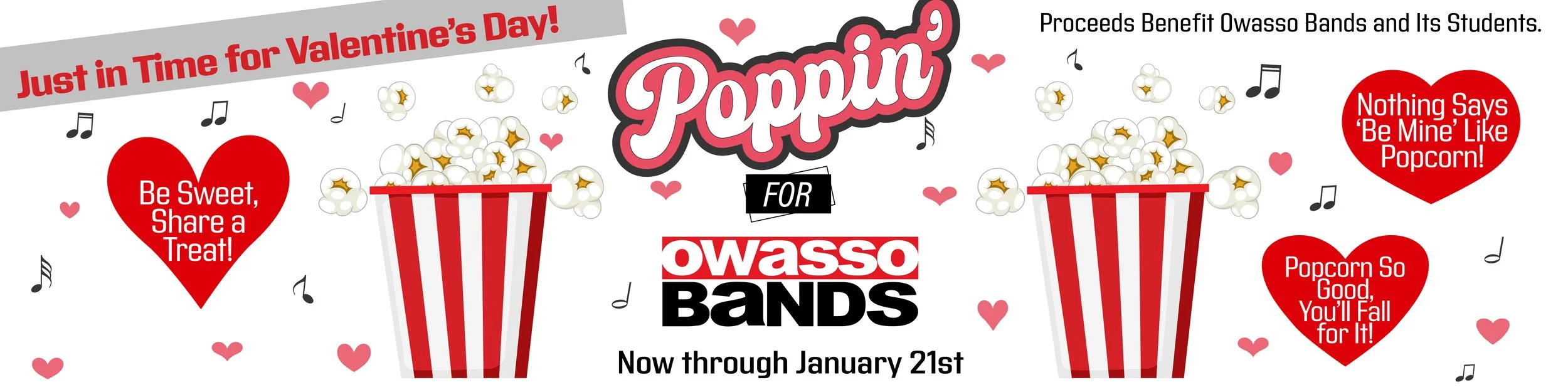 Get ready to indulge in the freshest, most delicious gourmet popcorn while supporting the talented students of Owasso Bands! We’ve partnered with Tulsa-based Premier Popcorn, a family-owned company that pops every kernel to perfection after your order is placed. Whether you’re craving sweet, savory, or something in between, there’s a flavor for everyone. Treat yourself or grab a bag for a friend—popcorn this good is perfect for snacking or gifting, especially with Valentine’s Day just around the corner!